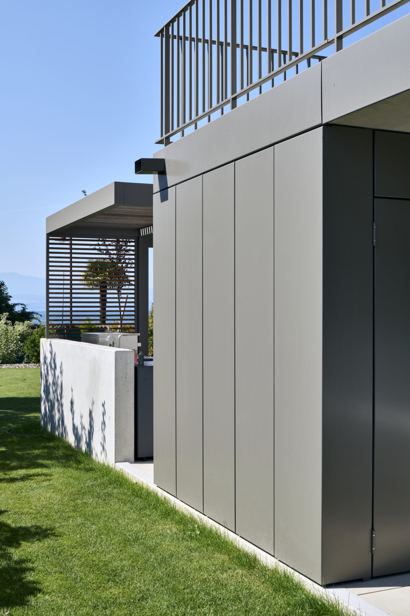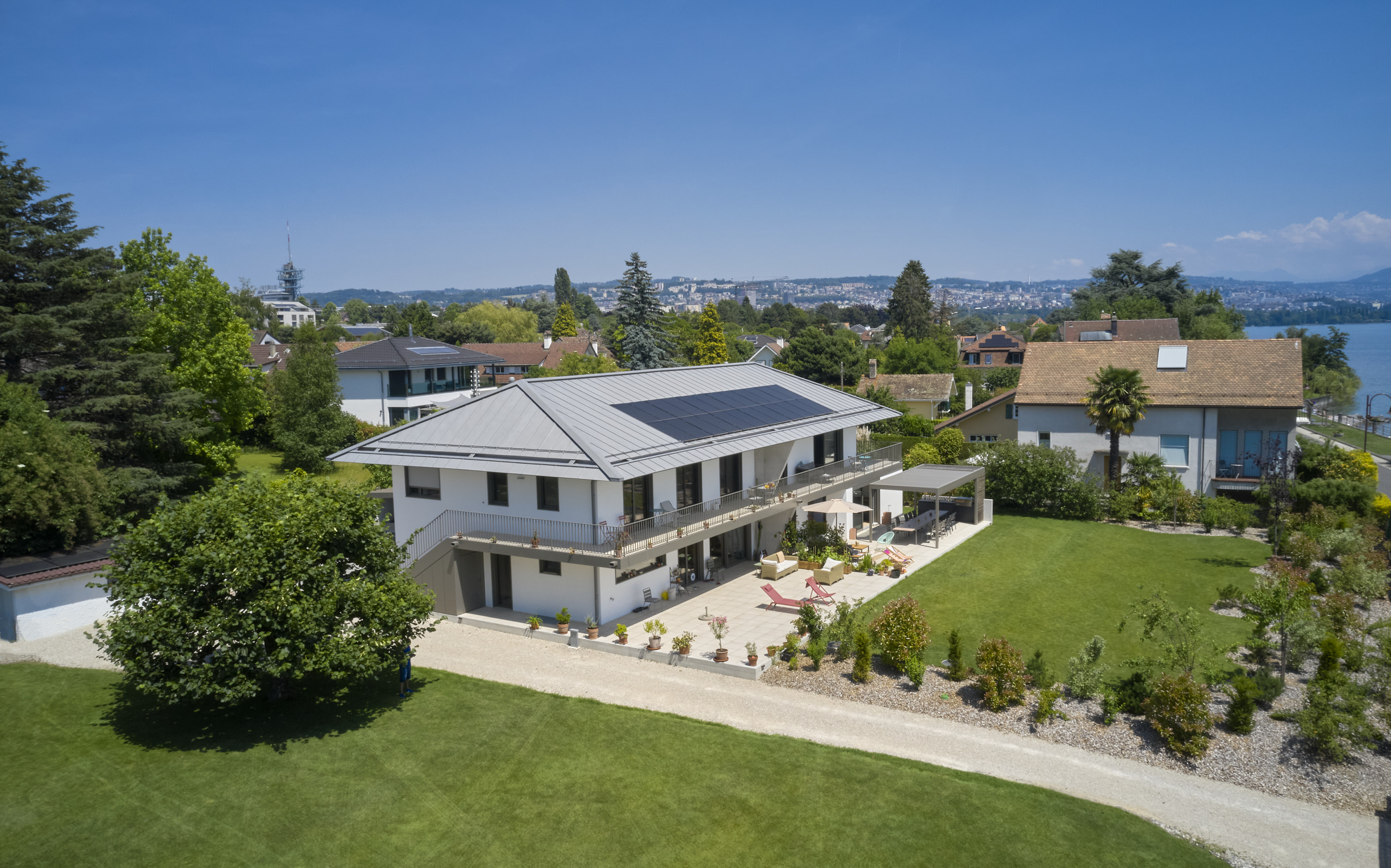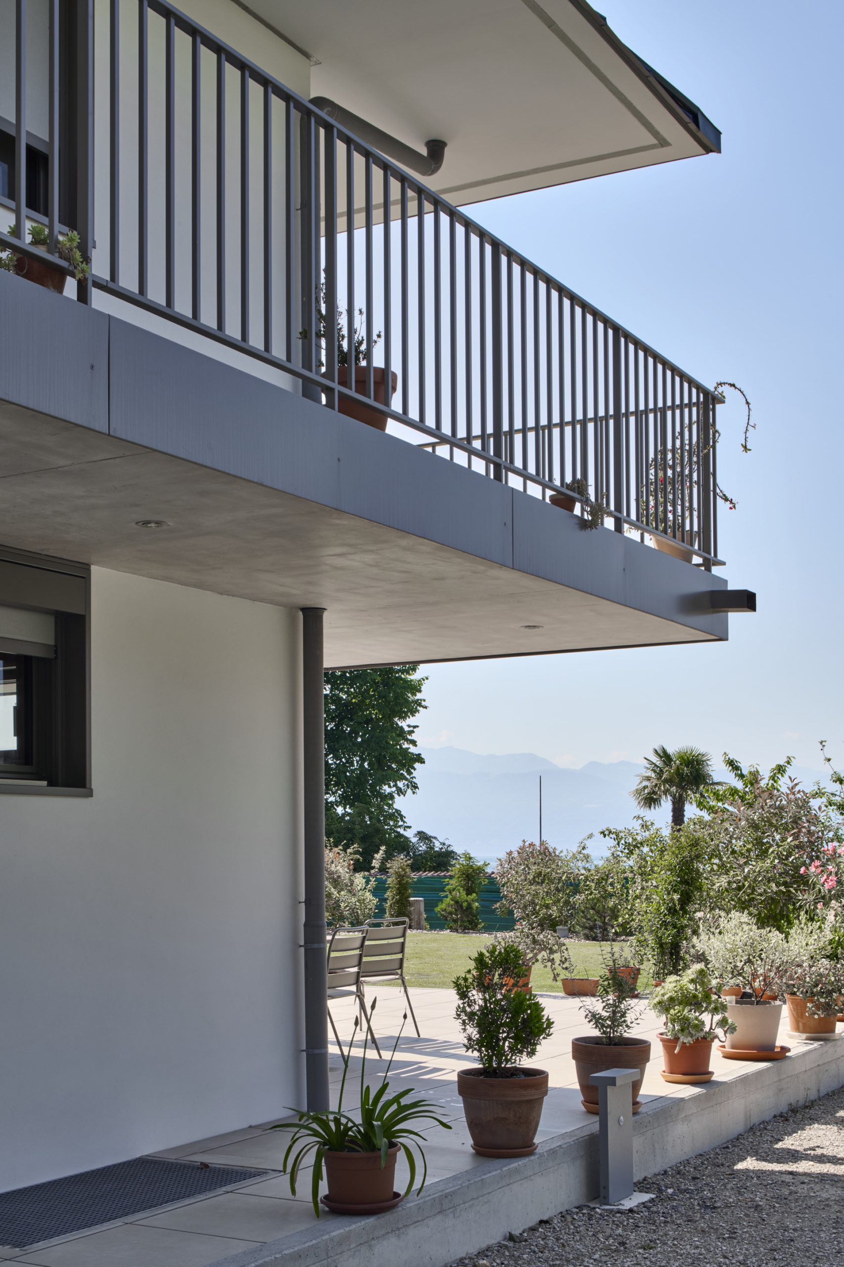 L’ensemble repose sur une dalle terrasse en surplomb du lac, socle minéral qui ancre les deux villas dans leur environnement et prolonge les espaces de vie vers l’horizon.