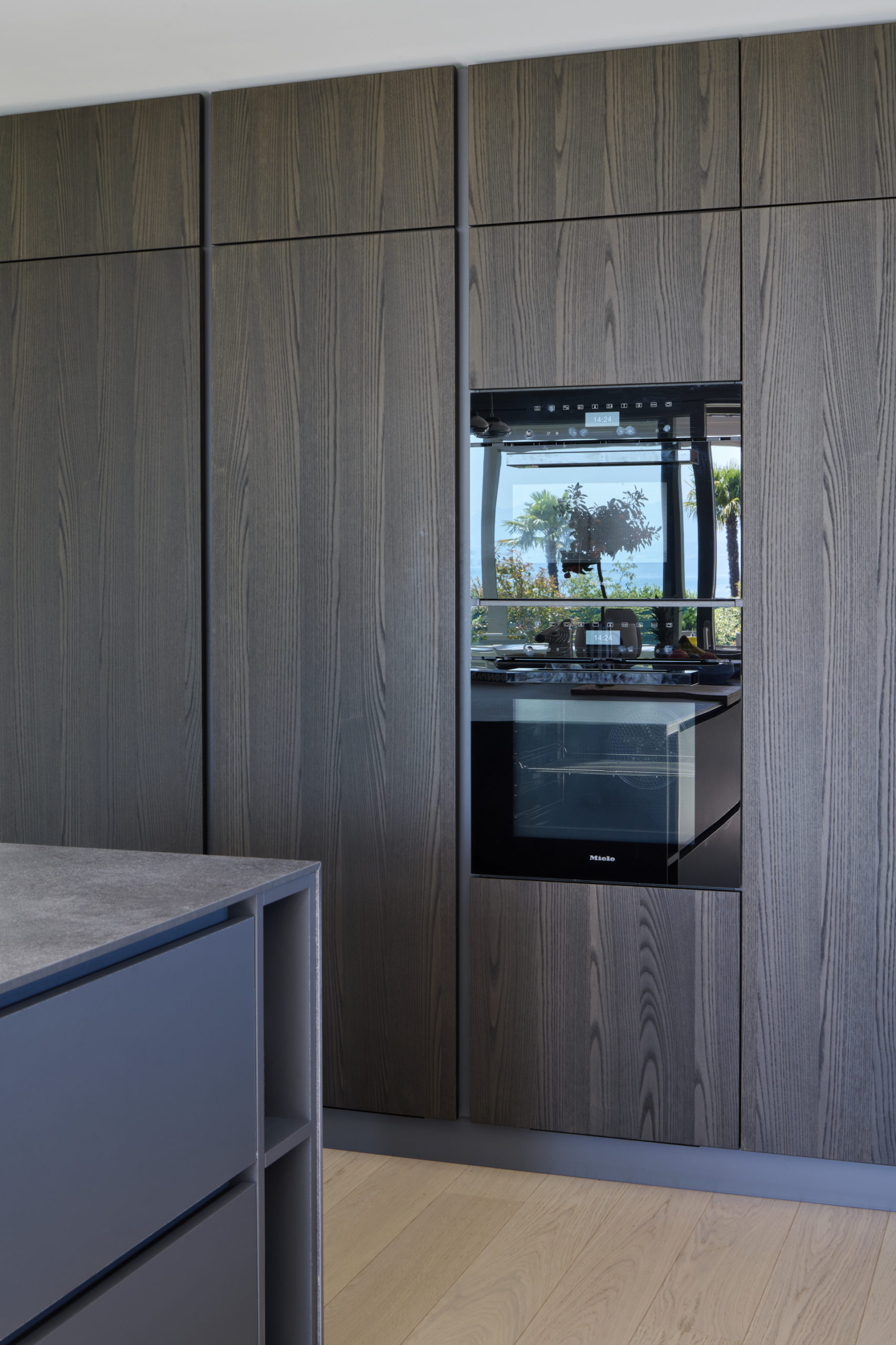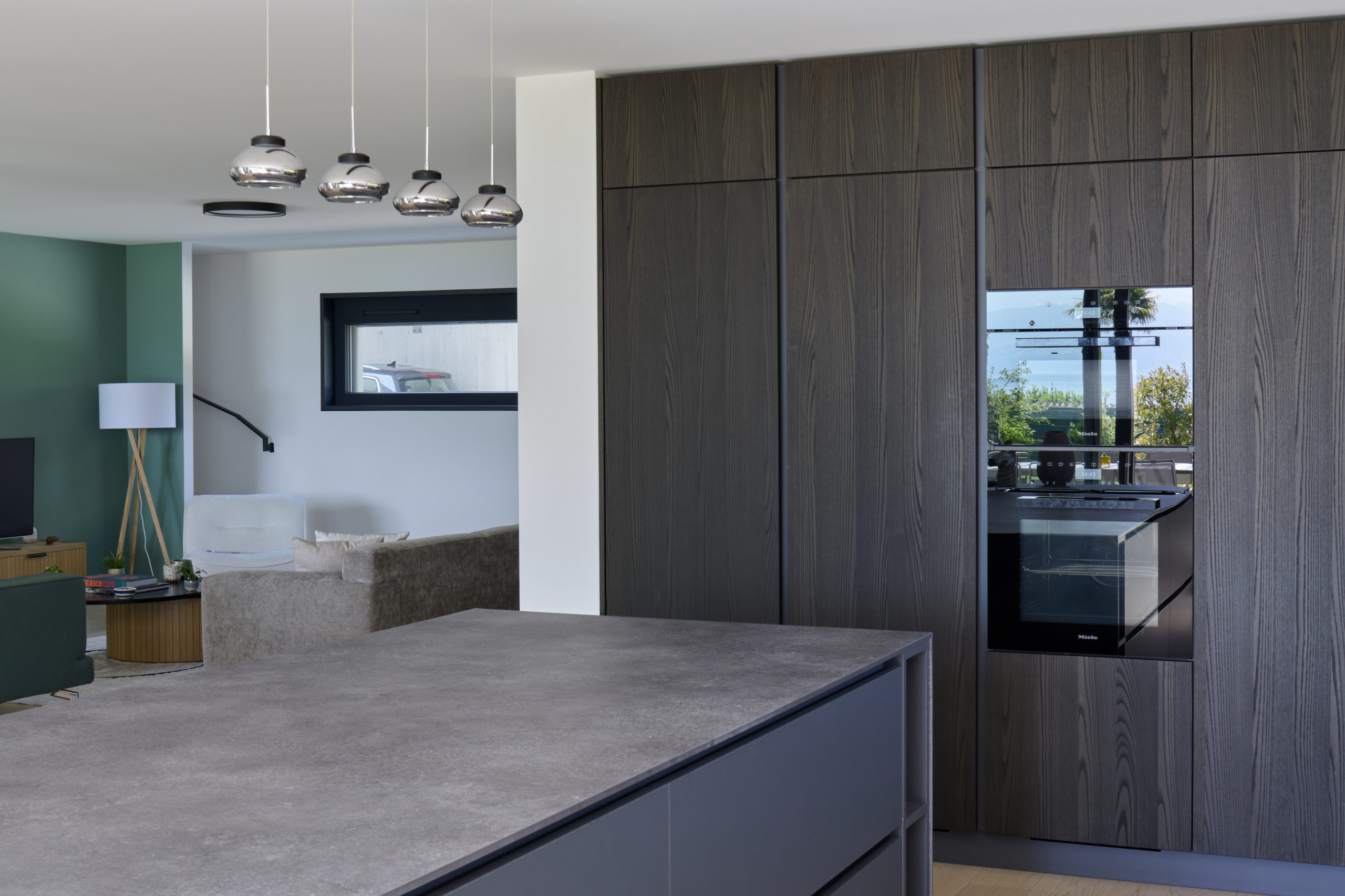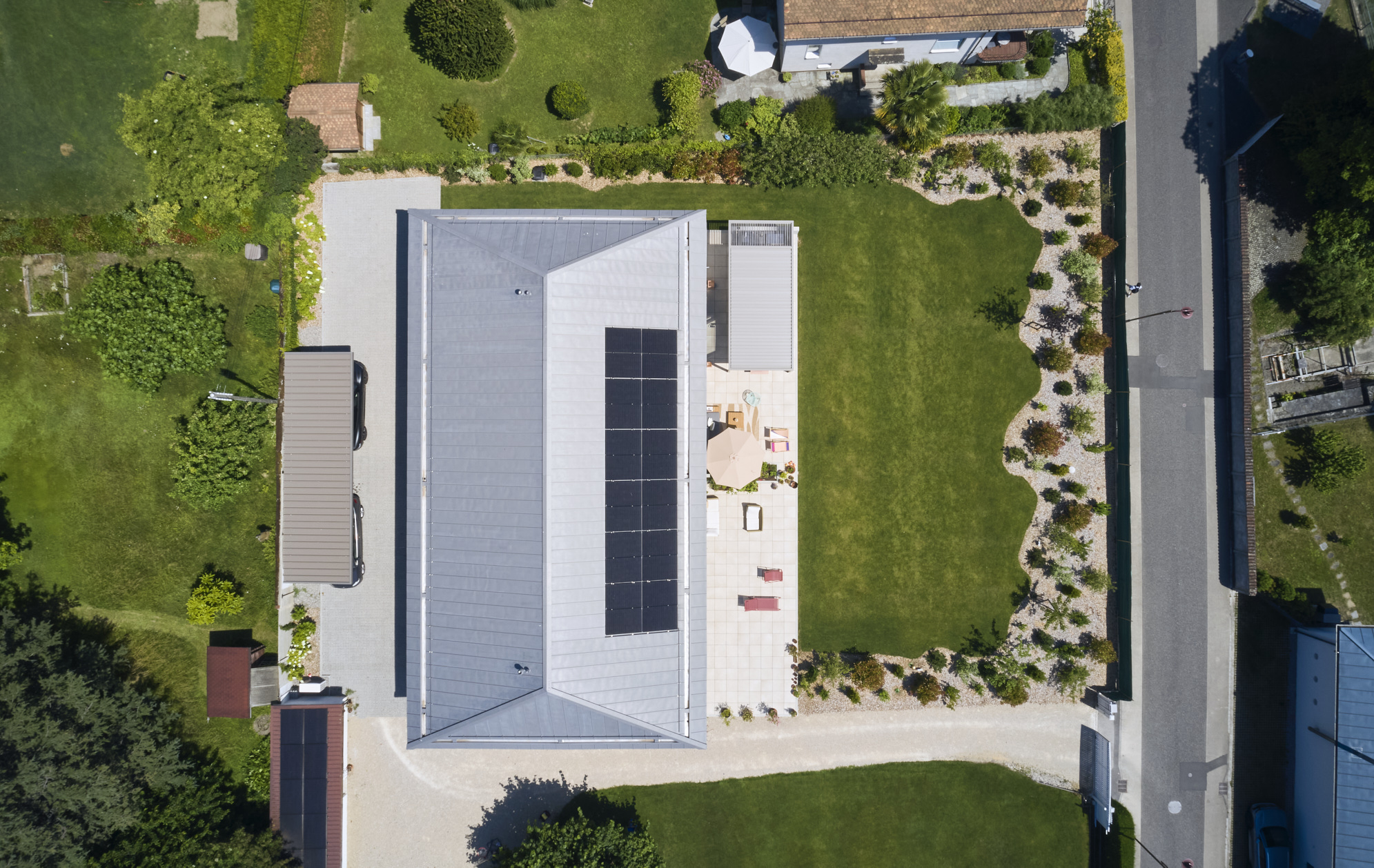 L’ensemble repose sur une dalle terrasse en surplomb du lac, socle minéral qui ancre les deux villas dans leur environnement et prolonge les espaces de vie vers l’horizon.