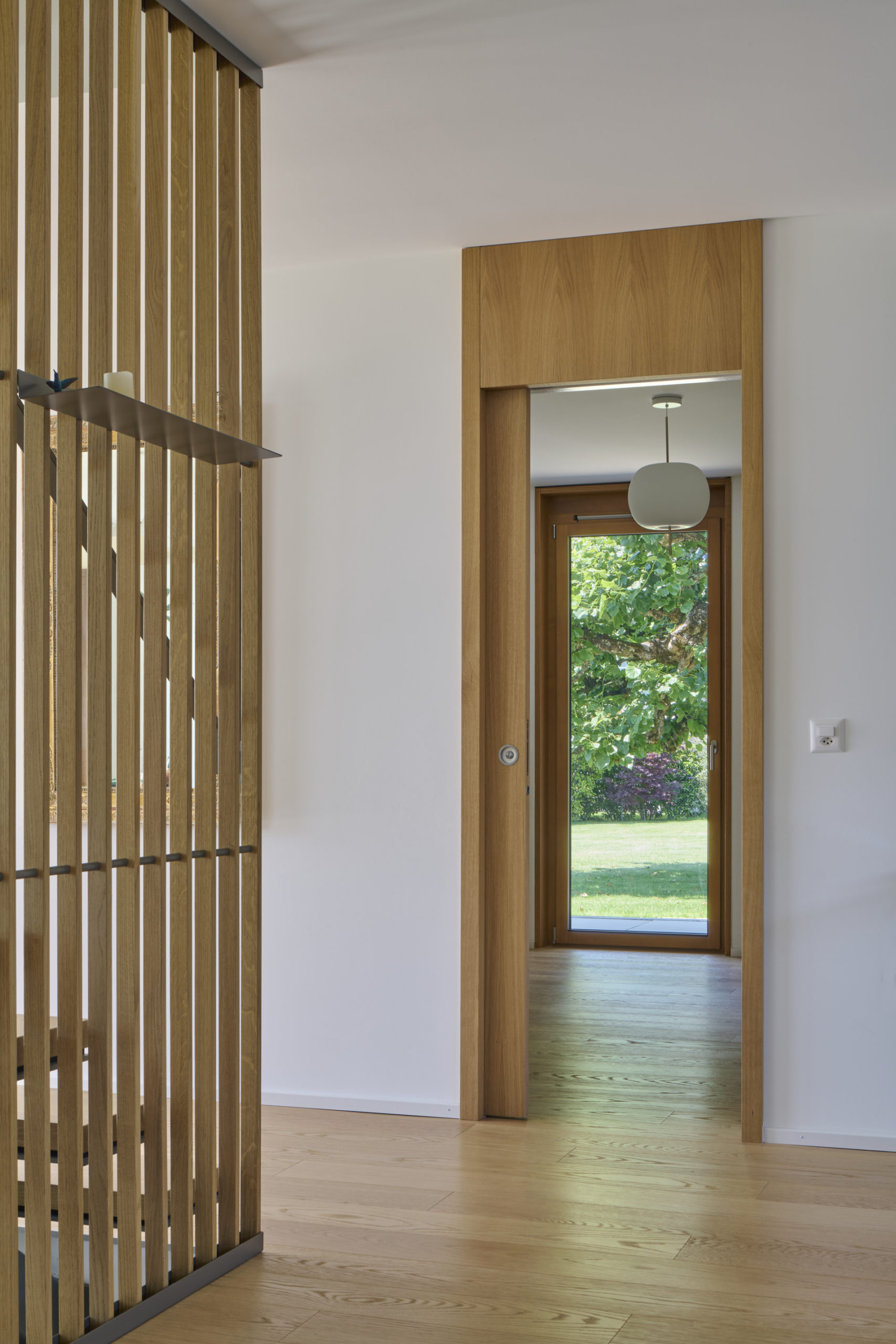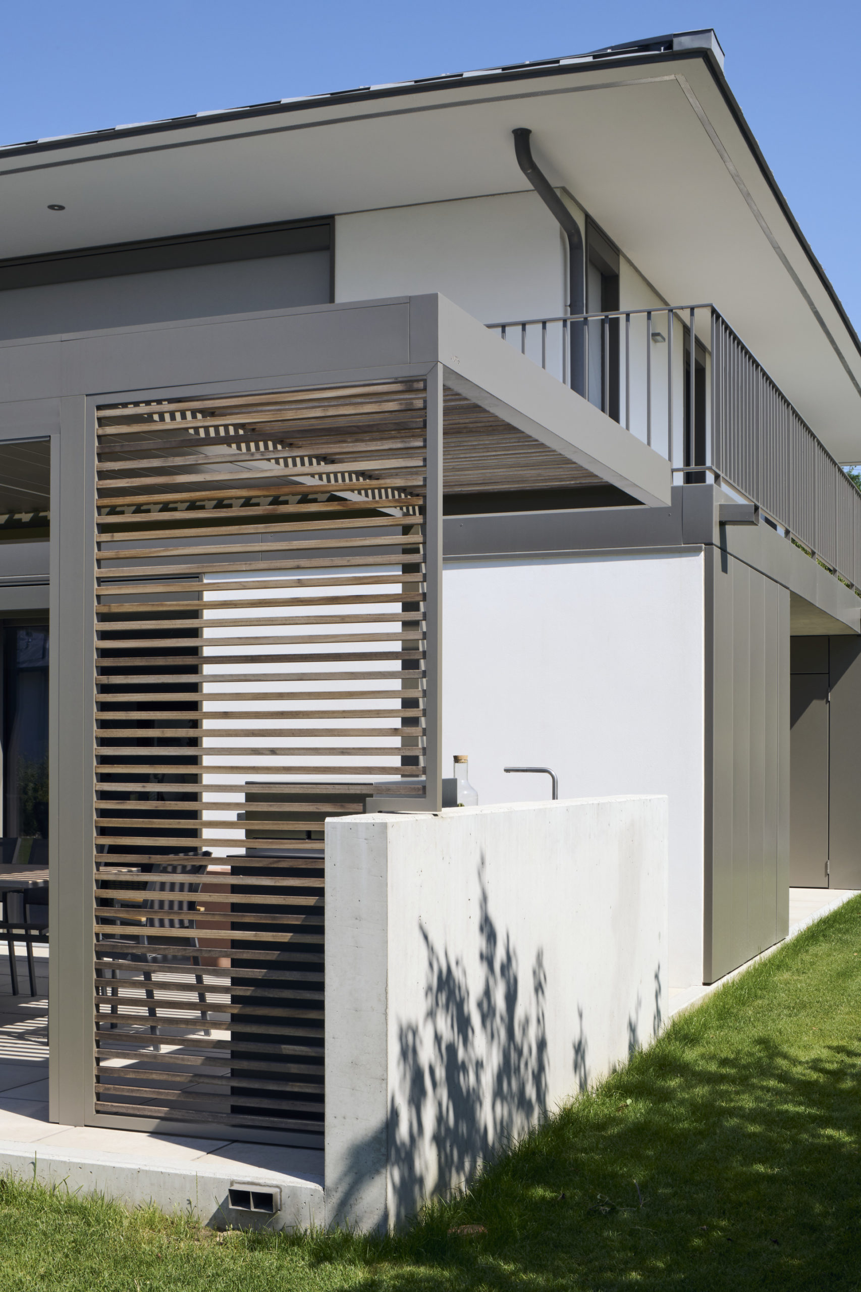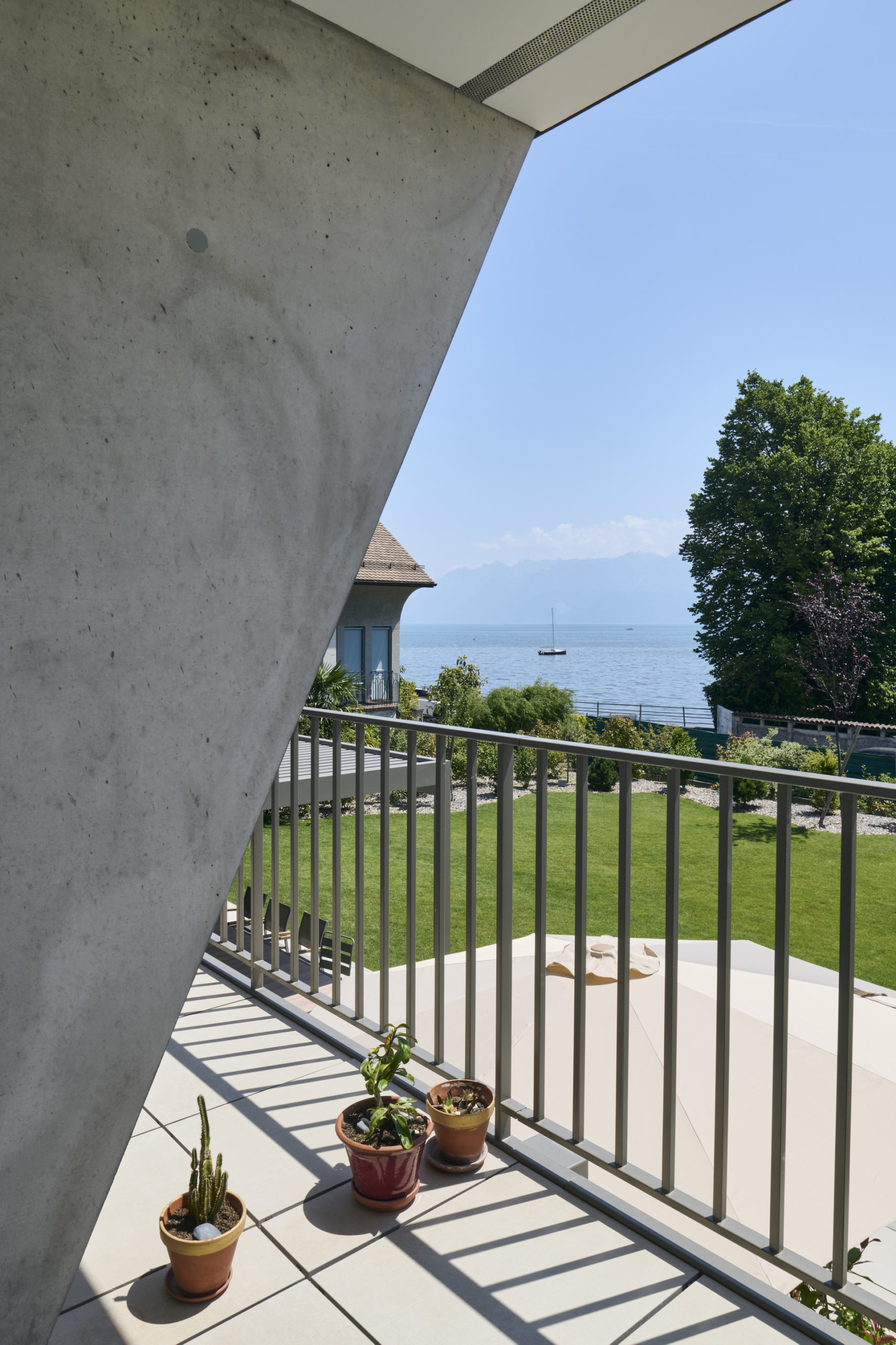 La toiture, ample et affûtée, s’affine progressivement vers ses extrémités en un large débord couvrant entièrement les balcons. Ce geste s’inspire des grandes couvertures de l’architecture traditionnelle japonaise et couronne les villas d’une silhouette reconnaissable depuis le lac.