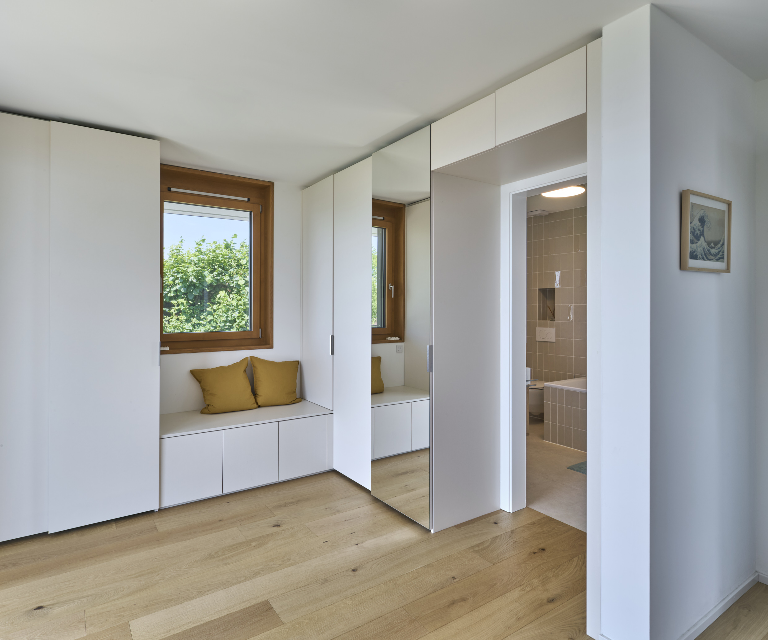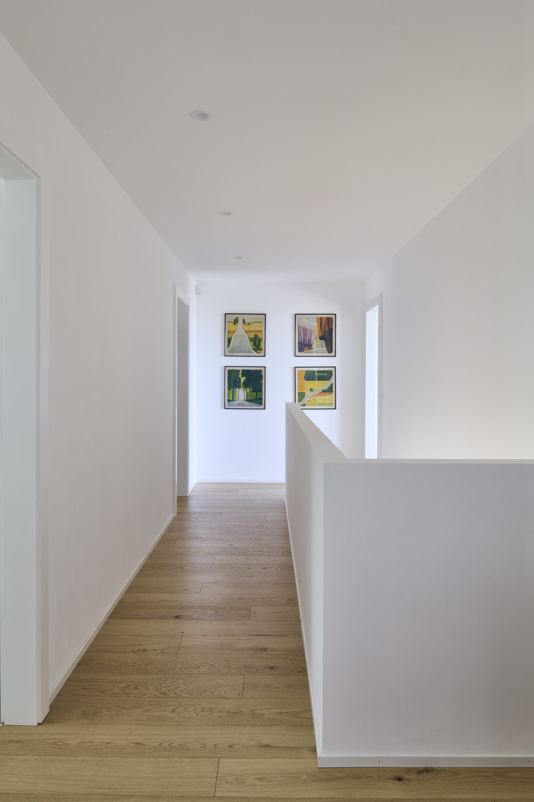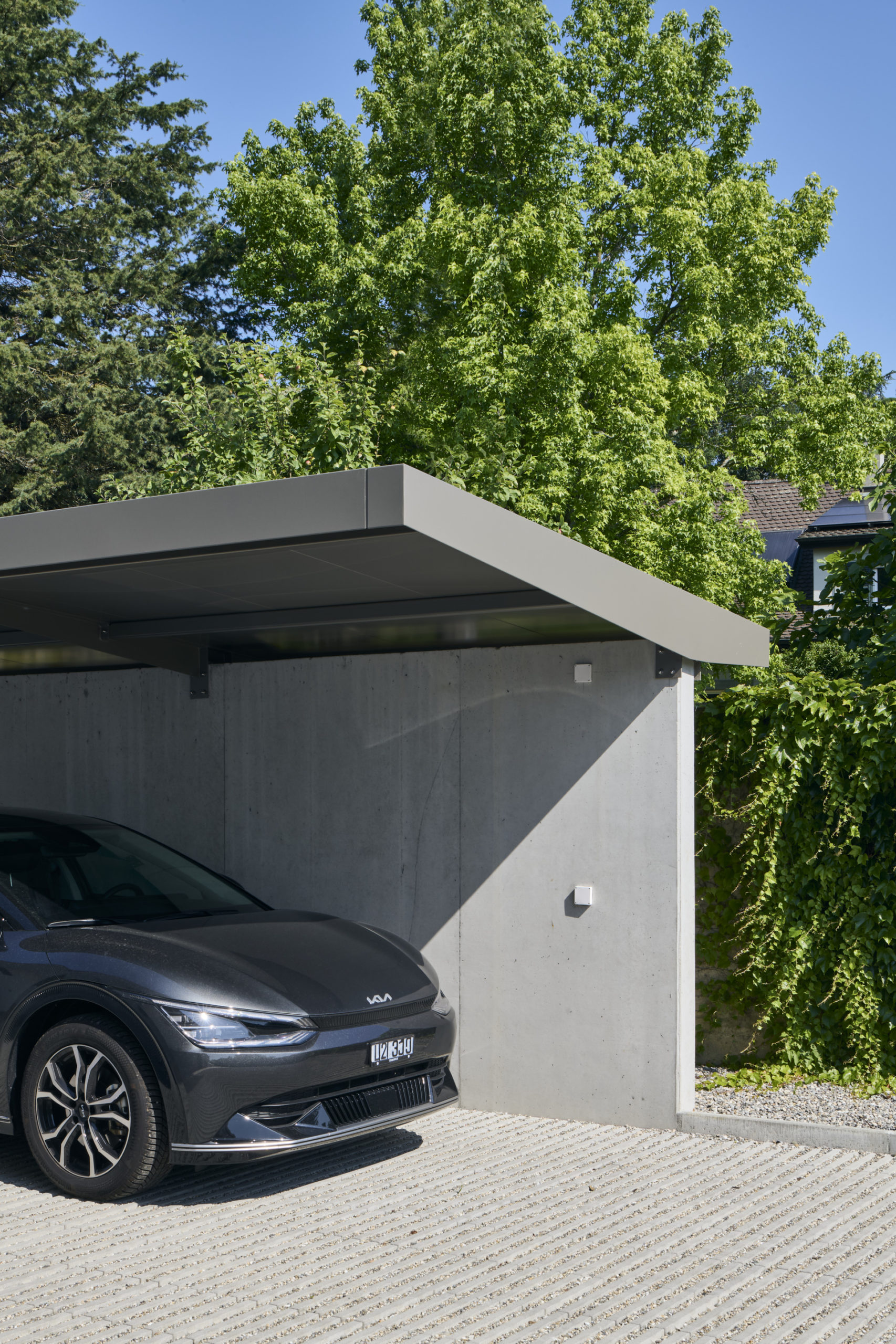 La toiture, ample et affûtée, s’affine progressivement vers ses extrémités en un large débord couvrant entièrement les balcons. Ce geste s’inspire des grandes couvertures de l’architecture traditionnelle japonaise et couronne les villas d’une silhouette reconnaissable depuis le lac.