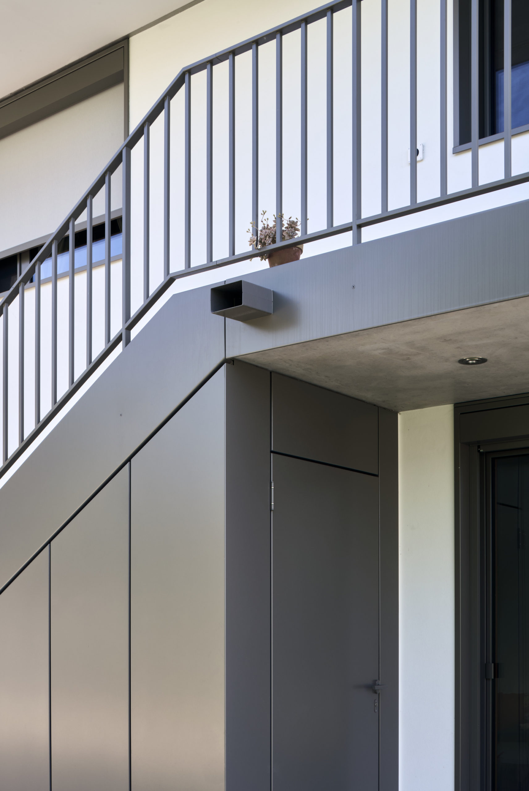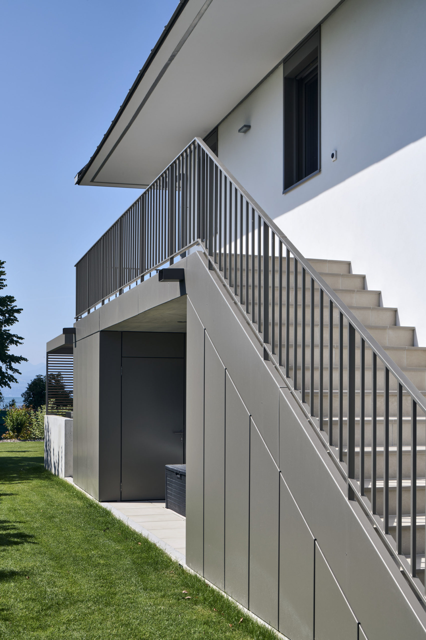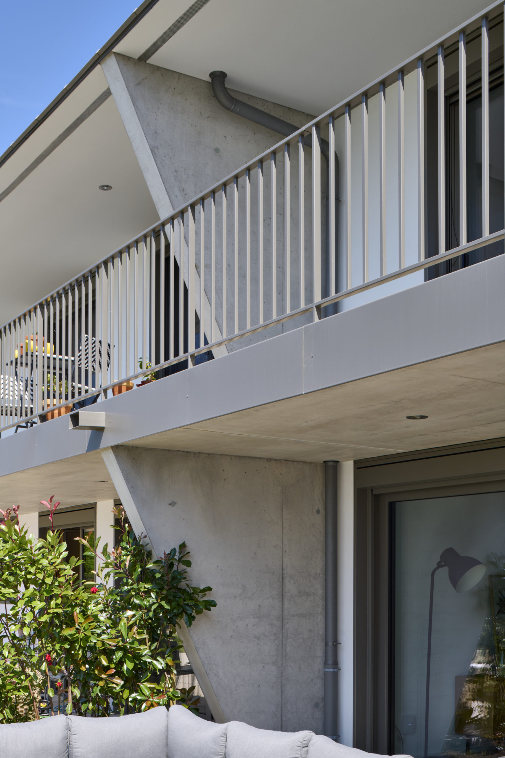 Les balcons sont accessibles directement depuis l’extérieur, par un escalier intégré à la composition de façade, qui confère à chaque niveau une autonomie et une lecture verticale claire.